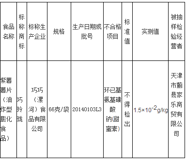 經檢測,標稱巧巧(漯河)食品有限公司生產的一個批次“巧玲瓏” 紫薯薯片(油炸型膨化食品)(66克/袋 20140103L3)環已基氨基磺酸鈉(甜蜜素)超標,標準要求不得檢出,實測值為“1.5×10-2g/kg”。
