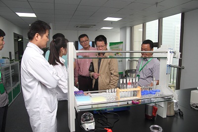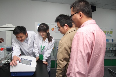 成立儀式結束后,技術人員對參觀人員進行現場檢測實驗演示,分別利用農藥殘留速測卡和農藥殘留速測儀快速檢測果蔬中的農藥殘留,讓參觀人員了解快速檢測技術的優勢。
