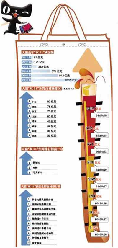 2016年的天貓“雙11”購物狂歡節已正式落下帷幕,全天總交易額達到了1207.49億元,其中無線交易額占比81.87%,交易覆蓋235個國家和地區。這是繼2015年912億元、2014年571億元之后,又一次刷新的成交額記錄。其他電商平臺如京東等,在此次“雙11”中也是戰績斐然,連創新高。