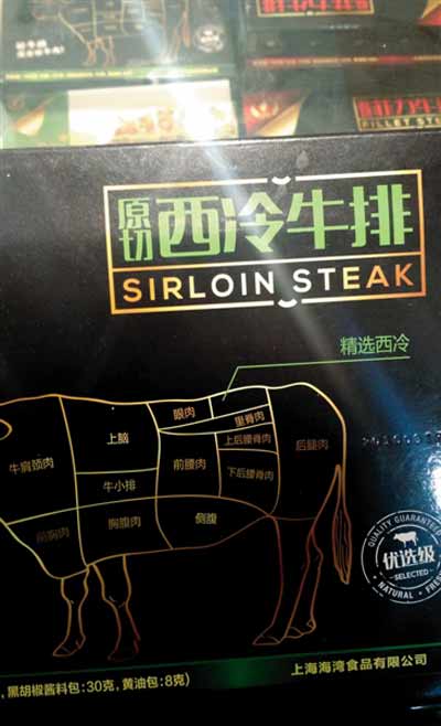 上海海灣食品有限公司生產的一款188g裝牛排產品,在配料表中注明添加了卡拉膠、谷氨酰胺轉氨酶等食品添加劑,但在產品包裝上卻冠以醒目的“原切菲力牛排”。另一款標稱為“原切西冷牛排”的產品,配料表顯示也添加了卡拉膠、黃原膠、三聚磷酸鈉等食品添加劑。兩款產品執行標準均為《SB/T10379-2012速凍調制食品》。