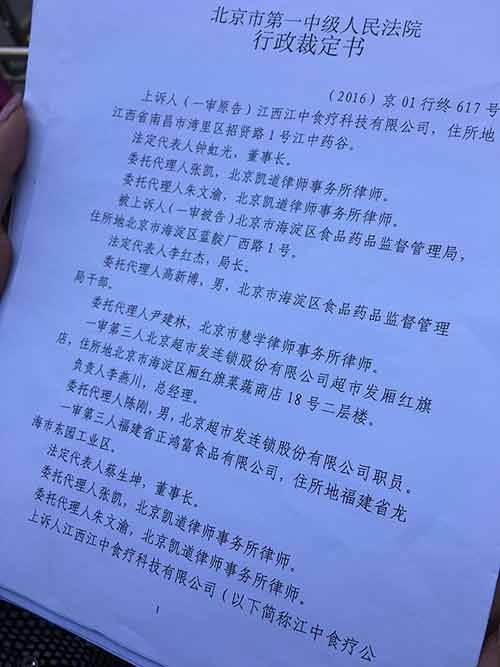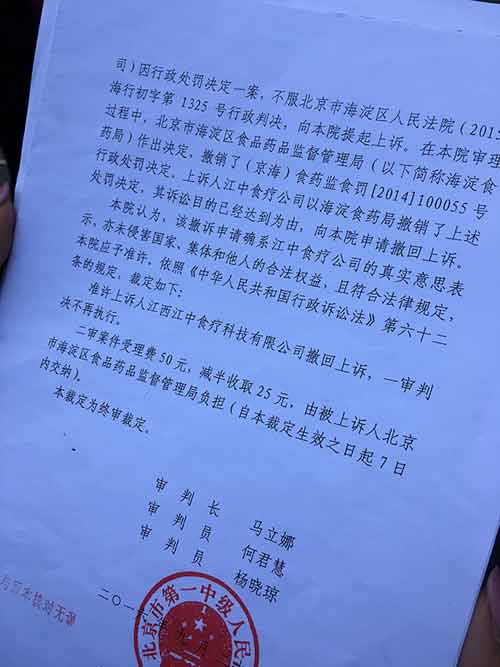 北京市第一中級(jí)人民法院的行政裁定書內(nèi)容顯示,海淀區(qū)食藥監(jiān)局已撤銷對(duì)江中此前的行政處罰決定。 澎湃新聞?dòng)浾?王文秋 圖