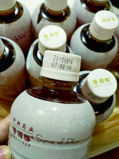昨日,記者見到了葉女士購買的這批過期酸梅湯,白色塑料包裝外標有“中新藥業隆順榕牌梅味酸梅湯果味飲料”,每瓶凈含量350克。瓶蓋側面所打印的生產日期顯示為2015年8月16日,而瓶體上注明的保質期為12個月。照此計算,該飲料在2016年8月16日之后就已過期。記者從葉女士的購物小票看到,購物時間為2016年12月4日,也就是說,她購買時過期已將近三個半月。