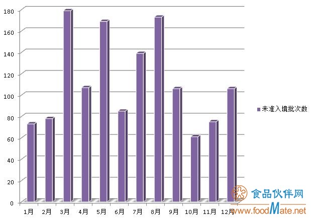 2018年共有1351批次超三千多噸食品檢出不符合我國法律法規(guī)和標準而未準入境。每月未準入境的食品批次數(shù)量如圖所示,其中,3月、5月、8月檢出的不合格批次數(shù)量居多。