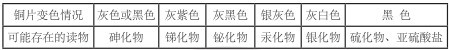 取樣品 5g 于三角燒瓶或蒸發皿中,加入 25ml 蒸餾水或純凈水,加入 5ml 鹽酸(如為水樣,取樣品 25ml,加鹽酸 5ml 即可),加入約 0.5g 氯化亞錫晶粒,將三角燒瓶放在電熱板上,調節溫控旋鈕使樣液微沸約 10 分鐘(驅除硫化物的干擾),此時加入 2 片銅片,保持微沸約 20 分鐘。注意隨時補加熱水,保持體積不變。若加熱 30 分鐘后銅片表面未變色,可否定砷、汞的存在,如銅片變色,可按下表推測樣品中可能存在的化合物,并可采取相應措施加以處理。保留陽性樣品,有條件時分別加以確證。