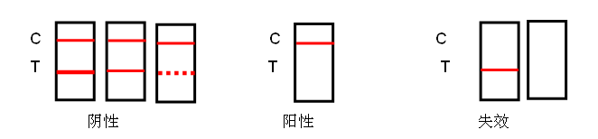 無效反應(yīng):C線不顯色,無論T線是否顯色,該檢測卡均判為無效。未出現(xiàn)C線,表明操作過程不正確或檢測卡已變質(zhì)失效。在此情況下,應(yīng)再次仔細閱讀說明書,并用新的檢測卡重新測試。