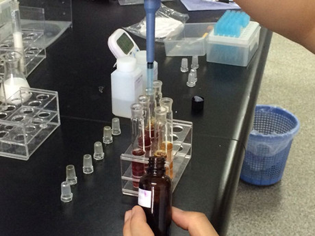 4、然后加入C溶液1.6mL,D溶液0.4mL,E溶液0.4mL,用水稀釋至10mL刻度,搖勻,靜置5min。
