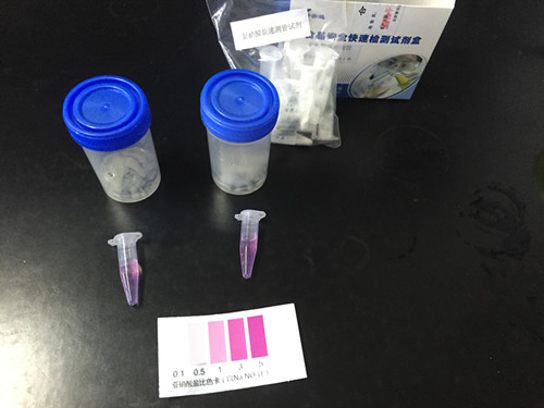 取上清液1.0ml加入到速測管中,蓋上蓋,將試劑搖溶,10分鐘后與標準比色卡對比,該比色卡上的數值乘上10即為樣品中亞硝酸鹽的含量mg/ kg;