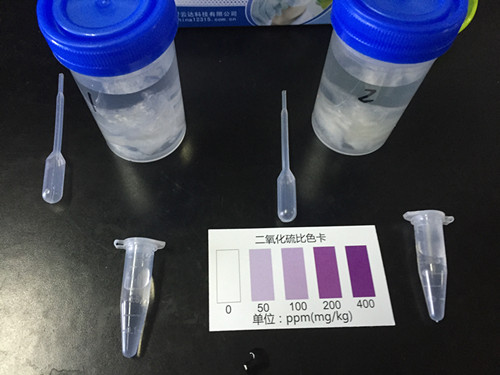 在1.5ml離心管中先滴加2滴檢測液A,1滴檢測液B,上下搖動,混勻;然后加入1ml樣品液,立即蓋塞混勻。放臵5分鐘觀察顏色變化,并與色卡對照,得出樣品中二氧化硫或亞硫酸鹽是否超標的信息。