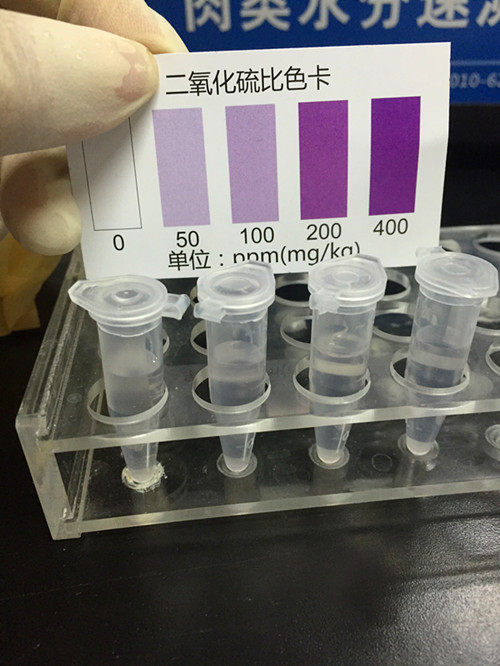 往離心管中的加入2滴試劑A和1滴試劑B混勻后,加入1ml備好的樣品液,靜置5min后比較比色卡,看是否添加二氧化硫。通過比較離心管中溶液和比色卡的顏色,我們可以判斷基本不含有二氧化硫,4種水果干都為陰性。