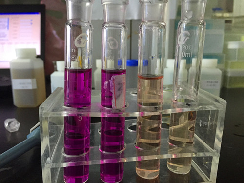 然后取一支10mL比色管,加入1mL樣品液,加入C溶液80μL,加蒸餾水至10mL刻度線,加入D溶液0.5mL,搖勻,開蓋靜置10min,加入F溶液0.5mL,迅速蓋塞顛倒兩次,迅速加入E溶液1mL,蓋塞混勻,靜置7min。處理完畢后作為樣品管。空白管:空白管內(nèi)加入蒸餾水替代樣品液,其余步驟與樣品管相同