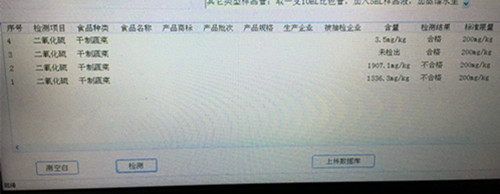 之后先用空白管校準(zhǔn),再檢測樣品管得到各個樣品二氧化硫含量都顯示只有2號為不添加二氧化硫的合格樣本,其他都添加了二氧化硫,但是其中1號為添加了少量二氧化硫的合格樣品,我國規(guī)定黃花菜中的二氧化硫的添加量為200 mg/kg,其他兩種含量分別為1907.1 mg/kg和1336.3 mg/kg,遠(yuǎn)遠(yuǎn)超出了我國的國家標(biāo)準(zhǔn),為不合格產(chǎn)品。
