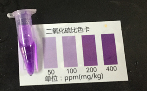 采用二氧化硫速測試管進行檢測,稱取1g枸杞樣本加入蒸餾水49ml,攪拌后靜置10min,之后轉移1ml到離心管中,加入2d二氧化硫檢測試劑A,1d二氧化硫檢測試劑B。攪拌均勻后,5分鐘后用離心管與比色卡進行比色。發現用二氧化硫的存在。