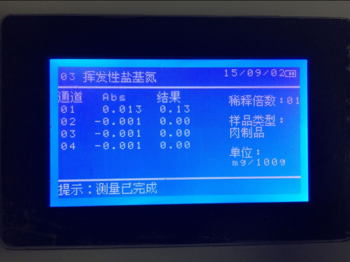 放入儀器中,檢測。檢測結(jié)果顯示揮發(fā)性鹽基氮含量。鮮(凍)畜肉≤15mg/100g,樣品中揮發(fā)性鹽基氮含量合格,符合國家標準。